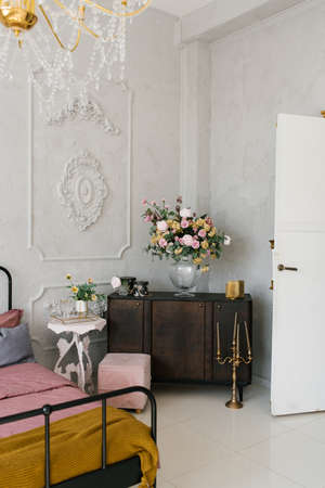 Classic bedroom interior. A brown wooden chest of drawers sits beside the bed