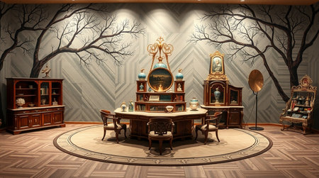 Elegant antique drawing room featuring wooden furniture, a sideboard with porcelain dishes, and classic decor. A chandelier and blue-lamp-shaded lamps enhance the sophisticated setting. AI generated image