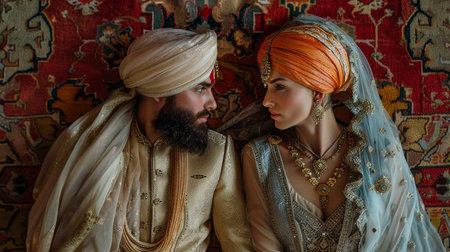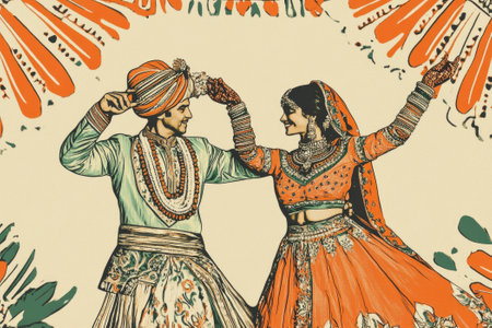 smiling Indian romantic couple in traditional Indian attire dancing together, retro illustration.