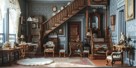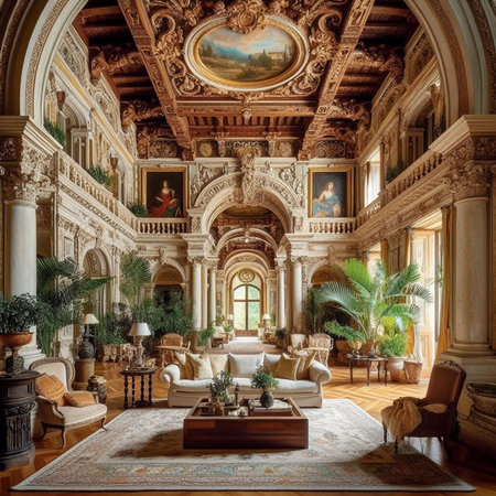 This image showcases the interior of a grand and opulent mansion,featuring a stunning hallway with intricate architectural details,including a magnificent staircase,ornate wood paneling,and a