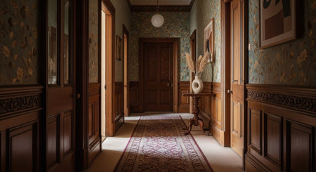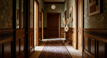Classic residential hallway with warm tones and wood details.