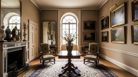 An elegant interior view of a historic room featuring classic oil paintings, antique chairs, and a central wooden table on an ornate rug. Large windows fill the space with natural light, highlighting the refined architecture and decor.