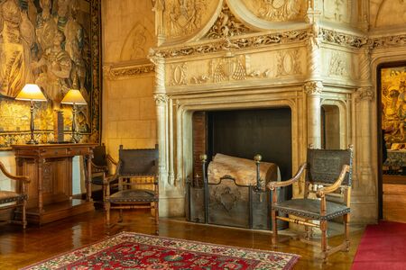 Chaumont-sur-loire, France -October 18, 2019: Interior chamber with fireplace Chateau de Chaumont, Loire Valley. France. Famous for its beautiful landscaped park and garden festival.