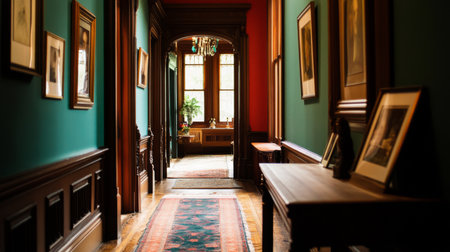 A traditional hallway featuring a rich color palette, ornate moldings, and family photos, capturing a sense of nostalgia and personal history in the home