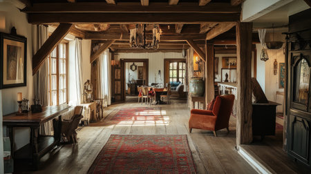 A rustic farmhouse-style hall with exposed wooden beams, vintage decor, and a welcoming ambiance.