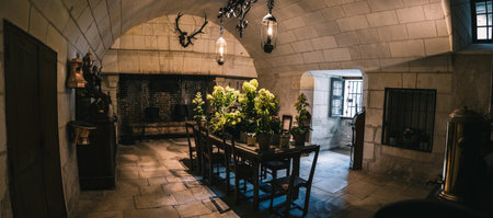 A beautiful medieval dining room interior with arched stone walls and hanging lights