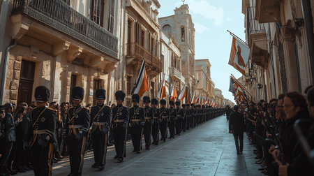 A solemn procession of male Cypriot soldiers in formal uniforms marches during a national day celebration. Flags of Cyprus wave proudly along the historic streets.