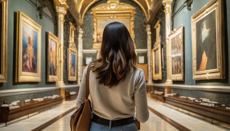 A person admires stunning paintings in a calm gallery filled with rich history and culture.