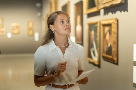 Woman with sheet piece of paper in hands view pictures and icons in museum hall