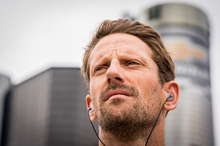 NTT INDYCAR SERIES driver, ROMAIN GROSJEAN (77) of Geneva, Switzerland stands for the national anthem before the Detroit Grand Prix on the Streets of Detroit in Detroit MI.