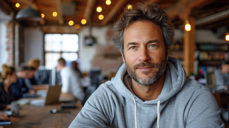 Ambitious tech start-up founder in a casual office, embodying entrepreneurial spirit and innovation.