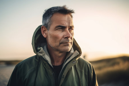 Portrait of a handsome middle-aged man in a green jacket on the beach