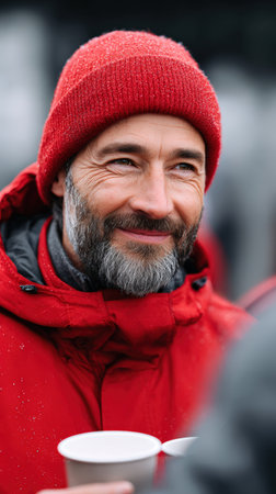 Happy man with gray beard, dressed in red winter attire, holding a warm beverage, enjoying a lively outdoor gathering with blurred people in the background