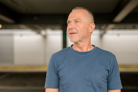 Portrait of a confident older man standing in a parking garage with neutral expression, short hair and casual clothing, looking directly at the camera.