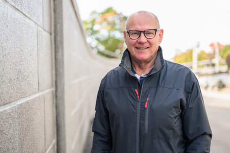 Portrait of a smiling mature man wearing winter jacket and cap outdoors