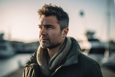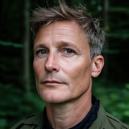 This image presents a close-up portrait of a middle-aged man. The subject's face is well-lit, highlighting facial features and a neutral expression. The photograph's composition emphasizes the man's gaze, with a blurred background. Suitable for various applications, including editorial content or commercial uses, the image conveys a sense of contemplation.