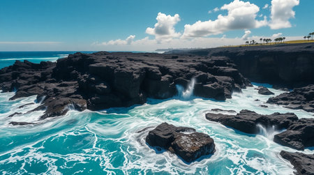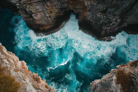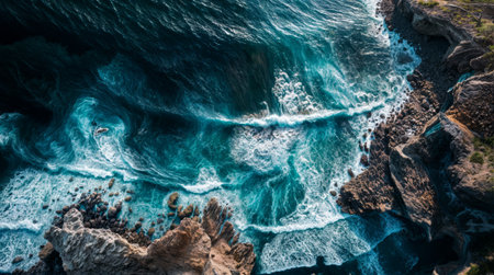An aerial shot showcases a rugged coastline where vibrant turquoise waves surge against dark, textured rocks. The composition displays dynamic patterns of water and stone with overhead lighting. Suitable for environmental themes, it provides a visual for travel, nature, and coastal projects, offering versatile applications.