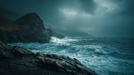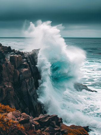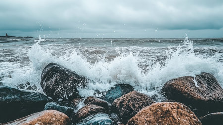 This image captures dynamic waves rolling in toward a rocky shoreline, showcasing the serene yet powerful nature of coastal landscapes under cloudy skies.