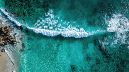 Experience the breathtaking beauty of an aerial view capturing waves crashing onto a sandy beach, surrounded by rocky formations and vibrant turquoise waters.
