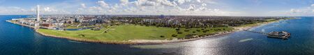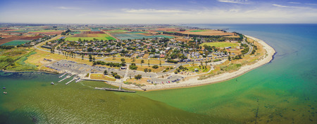 Aerial panoramic landscape of Werribee South colastline on bright summer day