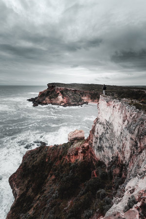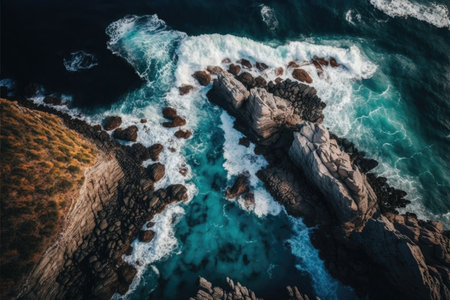Aerial View of the Ocean From a Cliff, Top view of fascinating rock formations among frothy oceanic waves, AI Generated