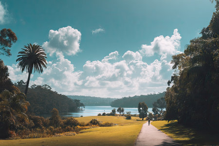 Paved path meanders through a parkland area, bordered by green grass and trees, leading to a tranquil lake beneath a partly cloudy sky.