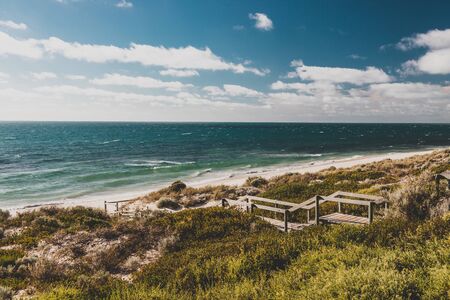 view of Cottesloe beach near Perth with thick vegetations and staircases leading to the sandy shore shot on a sunny and warm summer day