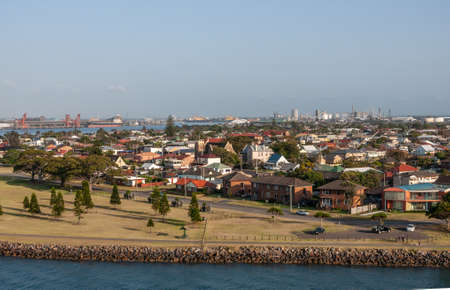 Newcastle, Australia - December 10, 2009: Looking over Stockton peninsula with Saint Pauls Church in center.. Industrial port installations of Carrington and Kooragang on horizon under light blue sky.