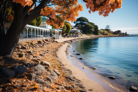 exotic and wild-looking beach with thick vegetation near the shore and no people shot in South Hobart in Tasmania, Australia
