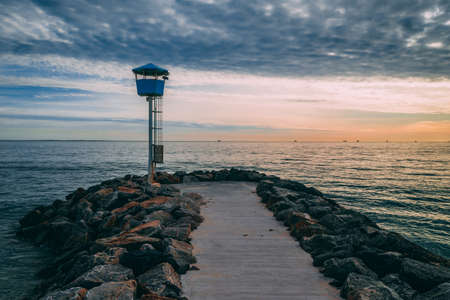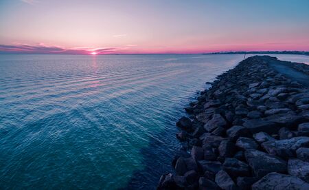 A beautiful shot of a dock surrounded by stones leading to the sea at sunset