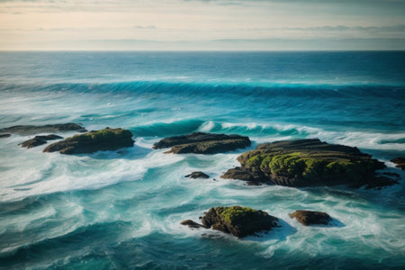 A beautiful blue ocean with a rocky shoreline. The water is calm and clear, and the rocks are scattered throughout the area. The scene is peaceful and serene, with the ocean