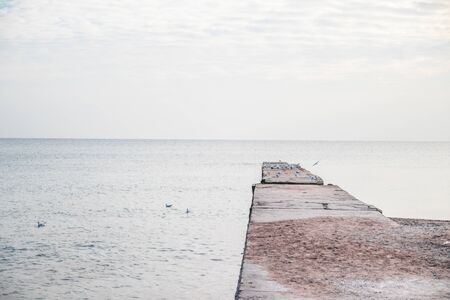 Seagull birds sit on a long stone pier at sea and blue sky. Pacific sea without waves