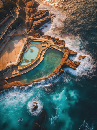 Generative AI : Aerial view of Sparks tidal pool Clarence Road Gordons Bay popular destination of swimmers South Africa