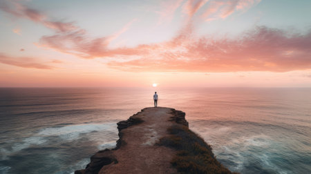 Top-down view of philosopher at cliff's edge serene ocean and tranquil sunset
