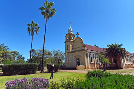 Old German colonial buildings and streets of Swakopmund, a town city in Namibia, dusty grey weather with clouds in sky