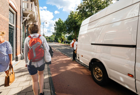 Woman walks on Dutch street near delivery man with parcels