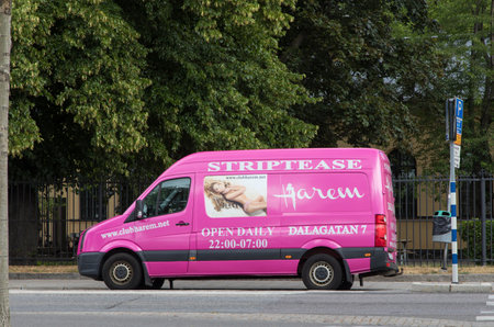 STOCKHOLM SWEDEN 1 Augusti 2017. Transport car with advertising for stripteas parked on a street in Stockholm