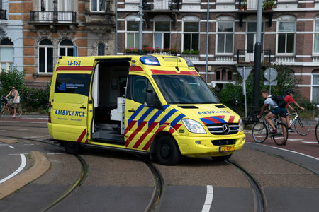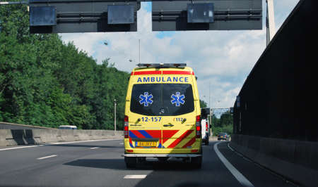Amsterdam, Netherlands - 26 December, 2015: Yellow ambulance in the street (highway) as editorial