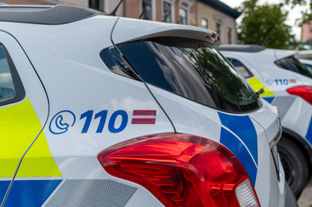 Police vehicles parked at a station in Latvia during the afternoon, showcasing emergency contact information