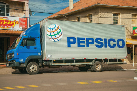 Cambara do Sul, Brazil, July 19, 2019. Pepsico brand painted on the side of a box truck in a stone street of Cambara do Sul. A town with amazing natural tourist attractions.
