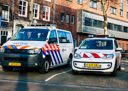 Amsterdam Netherlands April 8, 2019 View of a Dutch police car parked in the streets of Amsterdam in the afternoon