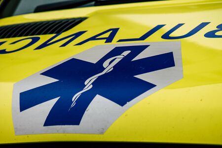 Rotterdam Netherlands April 1, 2019 View of a Dutch yellow ambulance parked in the streets of Rotterdam in the afternoon