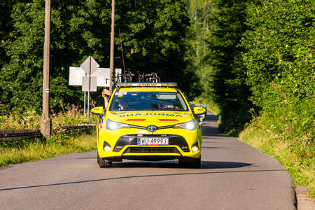 PORĄBKA NEAR BIELSKO-BIALA, POLAND - AUGUST 13, 2021: Cycling race Tour de Pologne 2021, stage 5 from Chocholow, Czarny Dunajec (pol. Chochołów) to Bielsko-Biała, professional cyclist riding throught streets in Porąbka, near Kocierz, Przegibek and