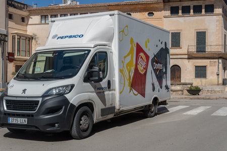 Felanitx, Spain; april 07 2022: Delivery van of the potato French fries company Lays and Doritos, parked in a central street of the Mallorcan town of Felanitx, Spain