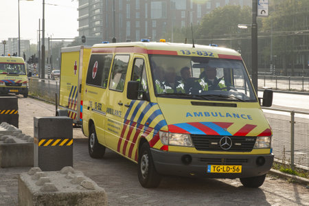 AMSTERDAM, NETHERLANDS - Sep 24, 2011: Dutch ambulance with trailer during a disaster exercise in Amsterdam
