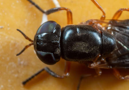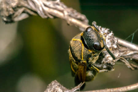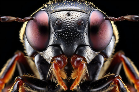 A stunning macro shot capturing the intricate details of a yellow and black insects face showcasing its large eyes and textured surface.