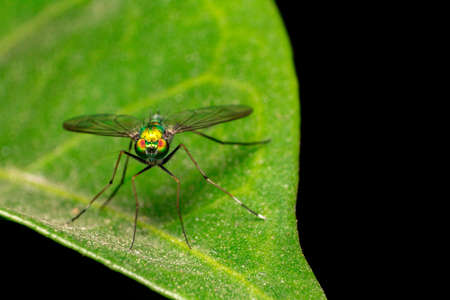 Close up of green long-legged fly or Austrosciapus connexus on green leaf. Insect photo in Thailand, Light nature background, Selective focus.