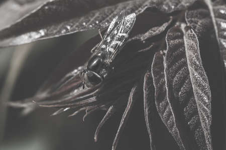 Extremely close-up of a dead fly covered with dust particles. Shallow depth of field dead insects