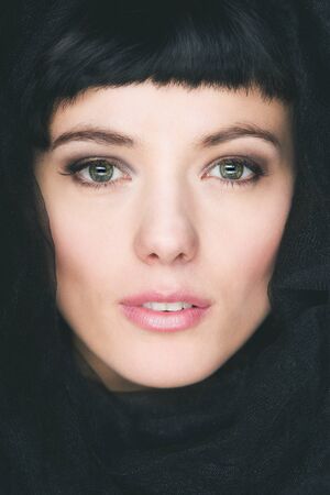 low angle view of young asian woman in black gloves holding black veil isolated on grey