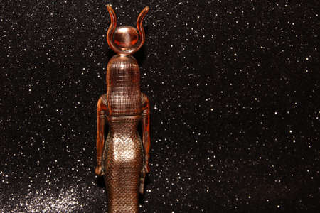 The Egyptian goddess ISIS on a black background. A bronze Egyptian goddess with a circle on her head.